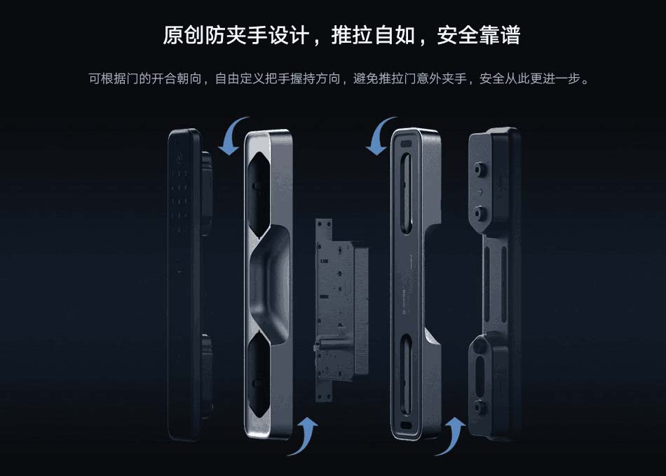 小米智能門鎖M20 采用高強(qiáng)度合金中框與一體化IML 工藝完美契合,正面黑晶面板上的隱形觸控按鍵和指示燈,讓整個(gè)門鎖渾然一體。無論是正面還是側(cè)面,M20 將小米的簡約風(fēng)格做到了極致。創(chuàng)新地采用了單邊內(nèi)凹防夾手把手設(shè)計(jì),可根據(jù)門的開合朝向,自定義把手的握持方向,避免推拉門意外夾手。