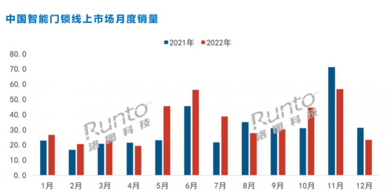 尤其是,線上渠道的市場(chǎng)發(fā)展在2022年仍然處于電商大周期中的半山腰,年度所有電商銷量占到全渠道的28.4%。根據(jù)洛圖科技(RUNTO)線上數(shù)據(jù),2022年,中國(guó)智能門鎖線上公開零售市場(chǎng)(不含抖音等內(nèi)容電商)監(jiān)測(cè)銷量為412萬套,同比增長(zhǎng)11.2%;銷額為53.5億元,同比增長(zhǎng)4.2%;市場(chǎng)均價(jià)為1291元,比去年同期下降87元。全年12個(gè)月,有6成的月份實(shí)現(xiàn)同比上漲。