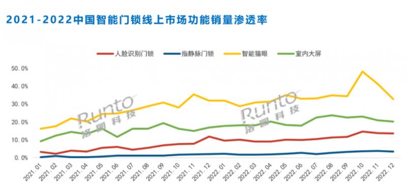 2022年,配備智能貓眼的智能門鎖線上銷量同比增長(zhǎng)45%,市場(chǎng)份額從2021年1月的16.2%增至2022年12月的32.8%。其中,在這個(gè)細(xì)分市場(chǎng),德施曼位居第一,其近一半的產(chǎn)品配備了智能貓眼。