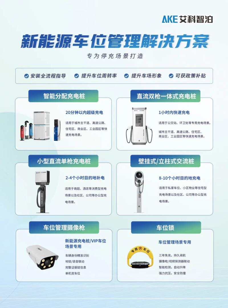 艾科智泊針對(duì)多種停充場(chǎng)景打造了一批優(yōu)質(zhì)的硬件產(chǎn)品,全方位為新能源車位管理提供運(yùn)行保障,解決新能源車位停充難題。