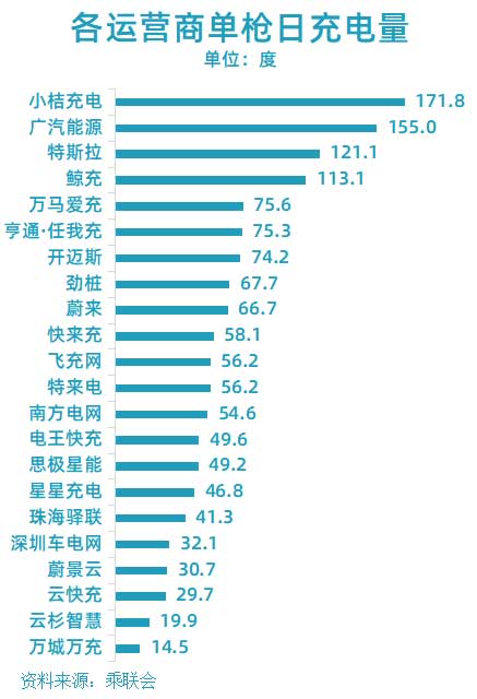 先來看一組乘聯(lián)會從中國充電聯(lián)盟獲取的數(shù)據(jù),其中,各運營商日單槍充電量最高的,是小桔充電171.8度,其次是廣汽能源155度和特斯拉121.1度。