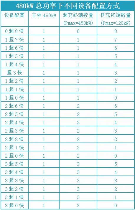 基于以上的條件,該項目為一套總功率為480kW的分體式充電堆,其中充電終端的設(shè)置可以靈活分配,充電模塊的分配顆粒度為60kW,則普通快充終端的配置可以是0-8臺不等,相對應(yīng)的超充終端可以為8-0臺。