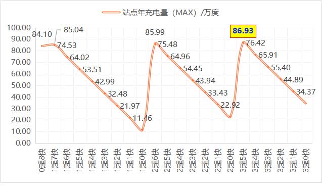 由于充電站的平均時間利用率不高,假設(shè)站點的效率最大化的情況,那就是每個充電終端在時間利用率期間,都能最大功率輸出,互不干擾,那么,充電終端多的配置充電量大,并且配置了更多的超充終端的充電量越大。如圖所示,配置3超5快的配置充電量最大。