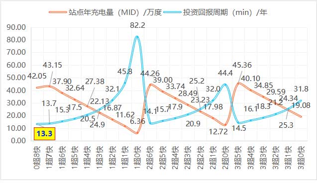 在經(jīng)營條件同等的條件下,項目配置的終端增多,建設(shè)成本增加,如果是配置的超充終端,成本相對也會有所提高。盡管實際充電量在配置的終端和超充終端多的(3超5快)會更高,但是綜合投資回報周期來看不是最優(yōu)的,反而是全部配置普通快充終端方式(0超8快)是最優(yōu)。