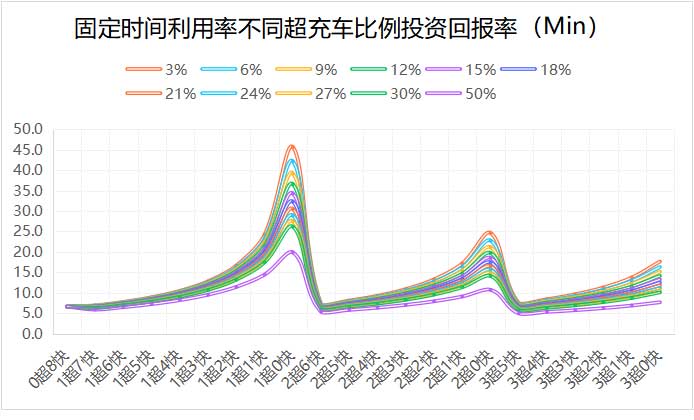 假設(shè)三:保持現(xiàn)有的充電終端的平均時間利用率不變的情況下,超充車輛占比提升,不同的充電站配置投資收益變化