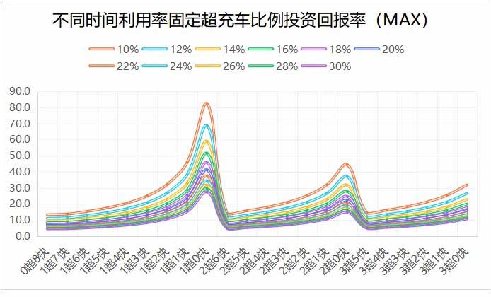 假設(shè)四:在超充車占比不變的情況下,充電終端平均時間利用率不斷提高,不同的充電站配置投資收益變化。