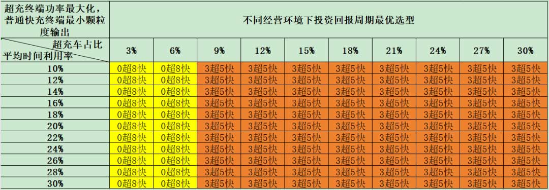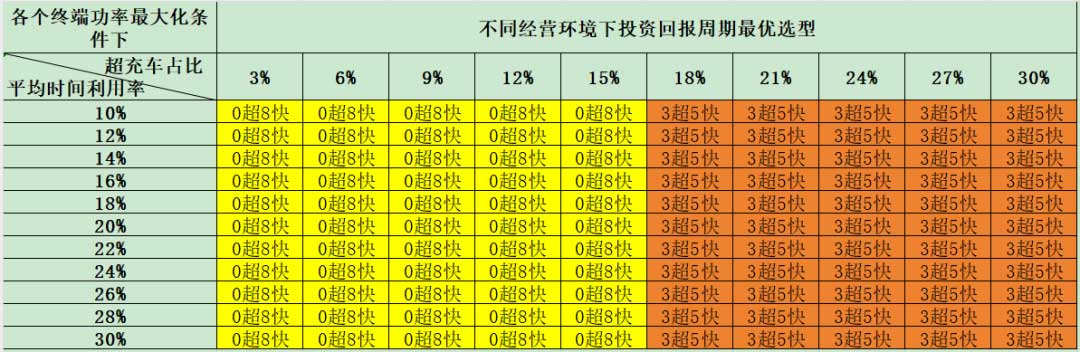 當(dāng)在各個終端都能夠最大化條件輸出的條件下,設(shè)備選型的臨界點是超充車輛占比在15%-18%之間。