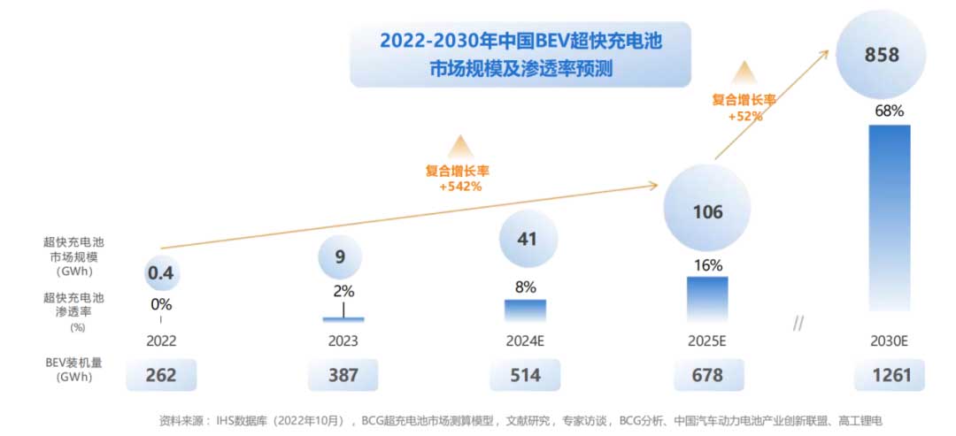 根據(jù)中國汽車動力電池產(chǎn)業(yè)聯(lián)盟預(yù)測,到2025年,電池裝機量將超過678GWh,其中超充電池約106GWh,占比16%,復(fù)合增長率高達(dá)542%。