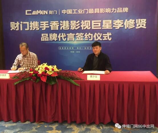 五年的奮斗成就了財(cái)門一線品牌的地位,但黃少安沒有停下前進(jìn)的步伐。新年伊始,黃少安又繁忙起來,簽約香港影視巨星李修賢為財(cái)門的品牌形象代言人;簽約央視,財(cái)門2018正式登陸央視,成為央視展播品牌;財(cái)門與中國(guó)伸縮門網(wǎng)、中出網(wǎng)簽訂品牌推廣戰(zhàn)略合作。