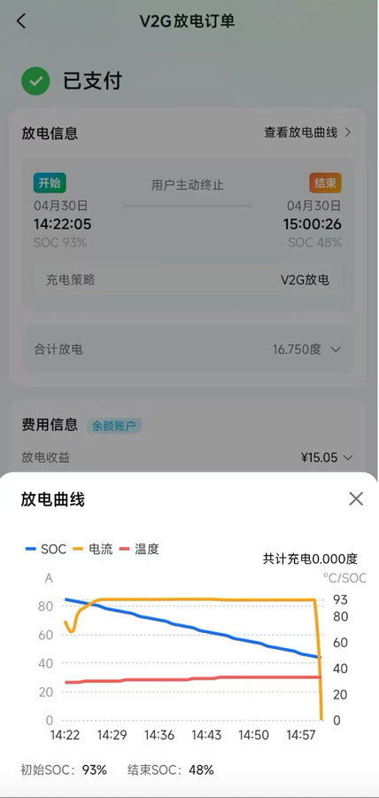 在超充站,郭誠剛向研究員展示了車主如何通過車網(wǎng)互動(dòng)放電。在40分鐘內(nèi),電動(dòng)汽車通過車網(wǎng)互動(dòng)放電約16.75度電,收入15.05元。郭誠剛談到,一般在工作日上班時(shí)間,車主可通過手機(jī)APP選擇充電結(jié)束時(shí)間,同時(shí)設(shè)置放電模式,實(shí)現(xiàn)充放電。以中環(huán)大場(chǎng)超充站為例,如果按照每個(gè)車網(wǎng)互動(dòng)雙向充電樁每天放電1次(40度電/次)來算,預(yù)計(jì)年充/放電量可達(dá)2.8萬度。