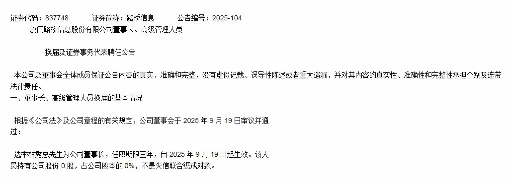 掌托人空缺一個(gè)月后,新接管的董事長為林秀總。路橋信息公告稱聘任林秀總先生為公司董事長及非獨(dú)立董事。資料顯示,林秀總,男,1973年1月生,碩士學(xué)歷。1996年進(jìn)入中鐵十七局集團(tuán)投身項(xiàng)目建設(shè),2005年進(jìn)入廈門路橋建設(shè)集團(tuán),在集團(tuán)內(nèi)部歷任項(xiàng)目經(jīng)理、綜合部經(jīng)理、副總經(jīng)理等多個(gè)職位,2023年9月至今任廈門信息港建設(shè)發(fā)展股份有限公司董事長。2025 年 9 月 19 日任廈門路橋信息董事長,持有公司股份 0 股,占公司股本的 0%。