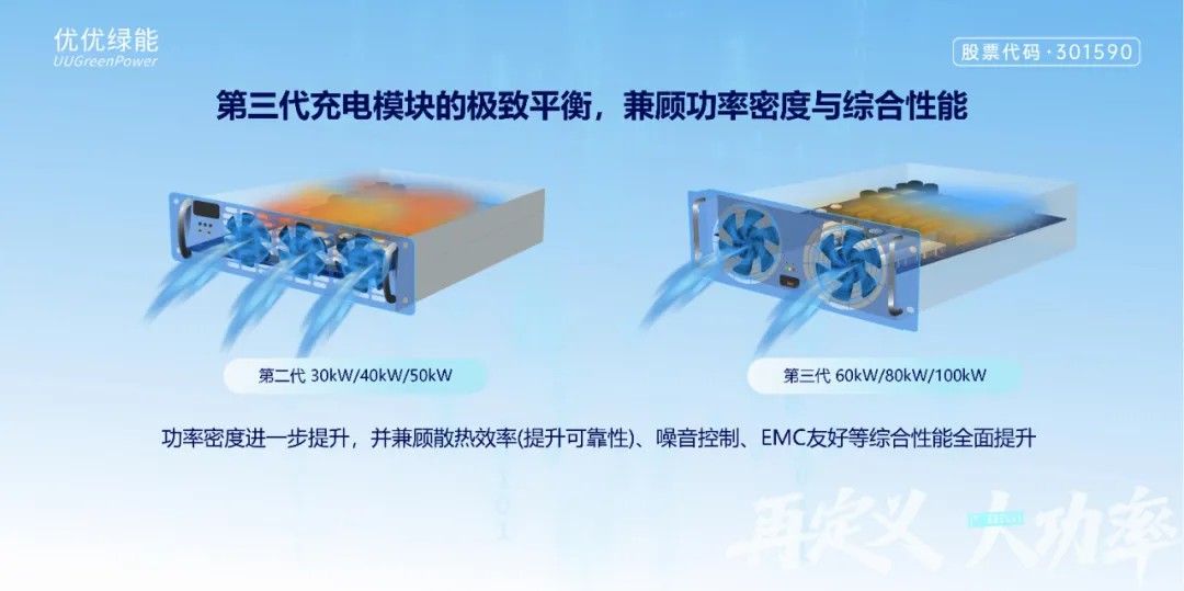第三代超大功率充電模塊不僅僅追求極致的功率密度,還從整體的散熱效率(提升可靠性)、噪音控制、EMC友好綜合考慮使用體驗。相比第二代充電模塊功率密度平衡化提升,通過更冗余的空間實現(xiàn)更綜合維度的低溫升、低噪音、高可靠充電體驗。