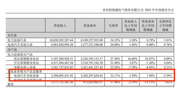 特銳德:子公司特來電作為充電樁行業(yè)頭部企業(yè),2025年年報(bào)數(shù)據(jù)頗具代表性。2025年其充電設(shè)備營收33.94億元,同比僅增長3.39%,而公共樁出貨量從70.9萬臺(tái)增至90萬臺(tái),增幅達(dá)26%,設(shè)備毛利率并沒有相應(yīng)增加,反而從35%以上降至32.17%。下降-2.59%。