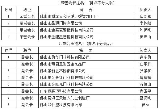 羅明輝先生對(duì)下屆理事會(huì)班子提名:推薦“金嘉豪智能科技有限公司”陳標(biāo)明董事長(zhǎng)擔(dān)任榮譽(yù)會(huì)長(zhǎng);推薦“金建星智能科技有限公司”黃錦山董事長(zhǎng)擔(dān)任榮譽(yù)會(huì)長(zhǎng);推薦“彩尼斯多智能科技有限公司”楊文泉董事長(zhǎng)擔(dān)任執(zhí)行會(huì)長(zhǎng);推薦“百思德門(mén)控智能設(shè)備公司”汪志平董事長(zhǎng)擔(dān)任執(zhí)行會(huì)長(zhǎng)(原推薦日?qǐng)F(tuán)五金塑料制品公司梁耀榮董事長(zhǎng)擔(dān)任,梁董因工作繁忙表示謙讓?zhuān)?;推薦“金鴻星智能科技公司”金國(guó)建董事長(zhǎng)擔(dān)任監(jiān)事長(zhǎng);推薦“鷹鋒五金制品公司”羅福林董事長(zhǎng)擔(dān)任副監(jiān)事長(zhǎng);推薦“晶源門(mén)控公司”官衛(wèi)林總經(jīng)理負(fù)責(zé)協(xié)會(huì)黨建工作;推薦“中國(guó)伸縮門(mén)網(wǎng)”程子芬擔(dān)任協(xié)會(huì)副秘書(shū)長(zhǎng),協(xié)會(huì)專(zhuān)職秘書(shū)長(zhǎng)暫時(shí)空缺;秘書(shū)處秘書(shū)兼財(cái)務(wù)許少燕繼續(xù)留任;其余常務(wù)副會(huì)長(zhǎng)、副會(huì)長(zhǎng)成員繼續(xù)留任,其余理事會(huì)成員繼續(xù)留任,本屆監(jiān)事任下屆理事,以上提名獲得理事會(huì)鼓掌通過(guò)。