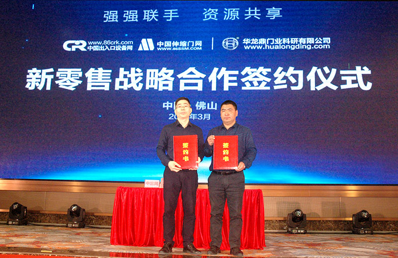 3月3日,中出網(wǎng)&中國(guó)伸縮門網(wǎng)在佛山舉行“強(qiáng)強(qiáng)聯(lián)手,資源共享”新零售戰(zhàn)略合作簽約儀式。中國(guó)建筑金屬結(jié)構(gòu)協(xié)會(huì)自動(dòng)門電動(dòng)門分會(huì)潘冠軍會(huì)長(zhǎng)、林夕范副會(huì)長(zhǎng)、佛山市自動(dòng)門行業(yè)協(xié)會(huì)羅明輝會(huì)長(zhǎng)、中出網(wǎng)&中國(guó)伸縮門網(wǎng)李明發(fā)董事長(zhǎng)、佛山金鴻星智能科技有限公司金國(guó)建董事長(zhǎng)和黃笑群總經(jīng)理、江蘇華龍鼎門業(yè)科研有限公司韓立軍董事長(zhǎng)、佛山市金建星智能科技有限公司黎圖總經(jīng)理等出席簽約儀式。