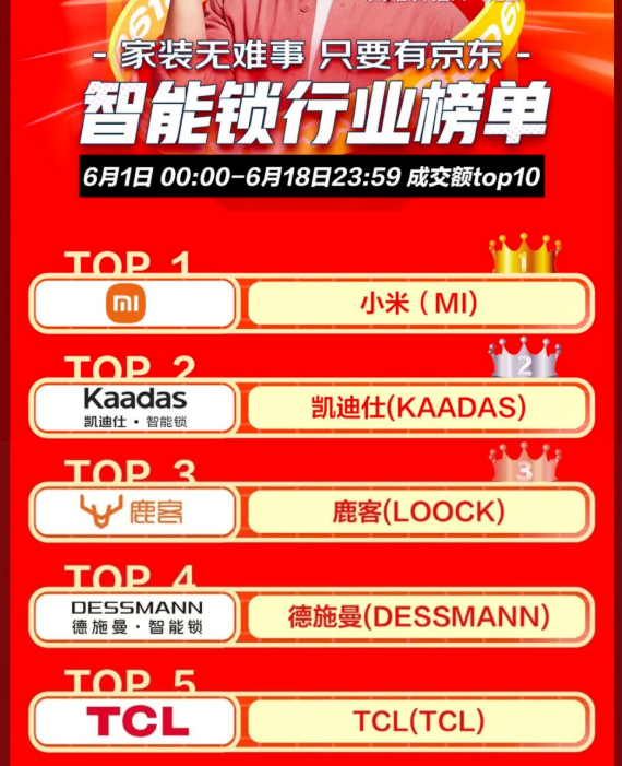 根據(jù)京東、天貓官方平臺(tái)數(shù)據(jù)顯示,智能鎖品牌銷量亮眼,其中,來(lái)自京東居家的戰(zhàn)報(bào)顯示,小米,凱迪仕、鹿客、德施曼、TCL、飛利浦、希箭、三星、石將軍、箭牌榮登成交額TOP10.
