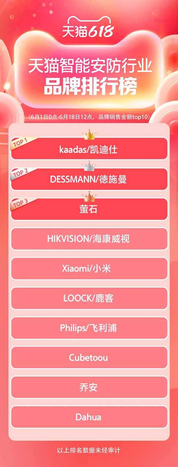 來(lái)自天貓數(shù)據(jù)的品牌排行榜顯示,凱迪仕、德施曼、螢石、??低?、小米、鹿客、飛利浦、Cubetoou、喬安、Dahua等品牌銷售金額TOP10。其中,來(lái)自凱迪仕的官方消息,天貓店成為618活動(dòng)智能鎖行業(yè)首個(gè)破億的品牌。