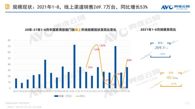 據(jù)奧維云網(wǎng)(AVC)《2021年1-8月中國智能門鎖線上市場總結(jié)報告》顯示,2021年1-8月,中國智能門鎖線上市場全渠道推總銷量為269.7萬臺,同比增長53%,銷額為40.5億元,同比增長65%;通過線上零售市場來看,近50%以上的同比增長,意味著智能鎖市場未來可期。