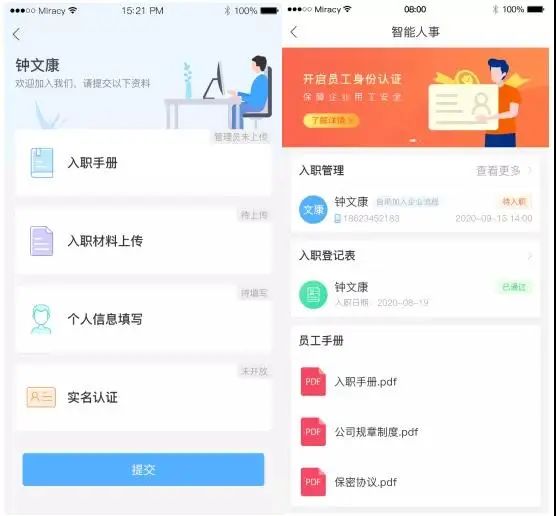 自助入職。ZKTeco+支持全程線上自助入職流程,員工使用ZKTeco+app完成入職文件簽署、入職材料上傳、個人信息錄入以及實名認證,HR在線完成入職審批,輕松應(yīng)對人快速入職,提升工作效率及工作體驗。
