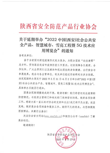 為配合國家“動態(tài)清零”總方針,貫徹落實省市疫情防控工作要求,切實保障各位展商、合作伙伴、廣大業(yè)界同仁以及媒體和觀眾朋友的身體健康、出行安全與參展效果,2022中國(西安)社會公共安全產品、智慧城市、雪亮工程暨5G技術應用博覽會與各主管單位、有關單位經過仔細研判與多方溝通,決定延期舉辦原定于2022年5月31日-6月2日舉辦的“2022中國(西安)社會公共安全產品、智慧城市、雪亮工程暨5G技術應用博覽會”,具體舉辦日期另行通知。