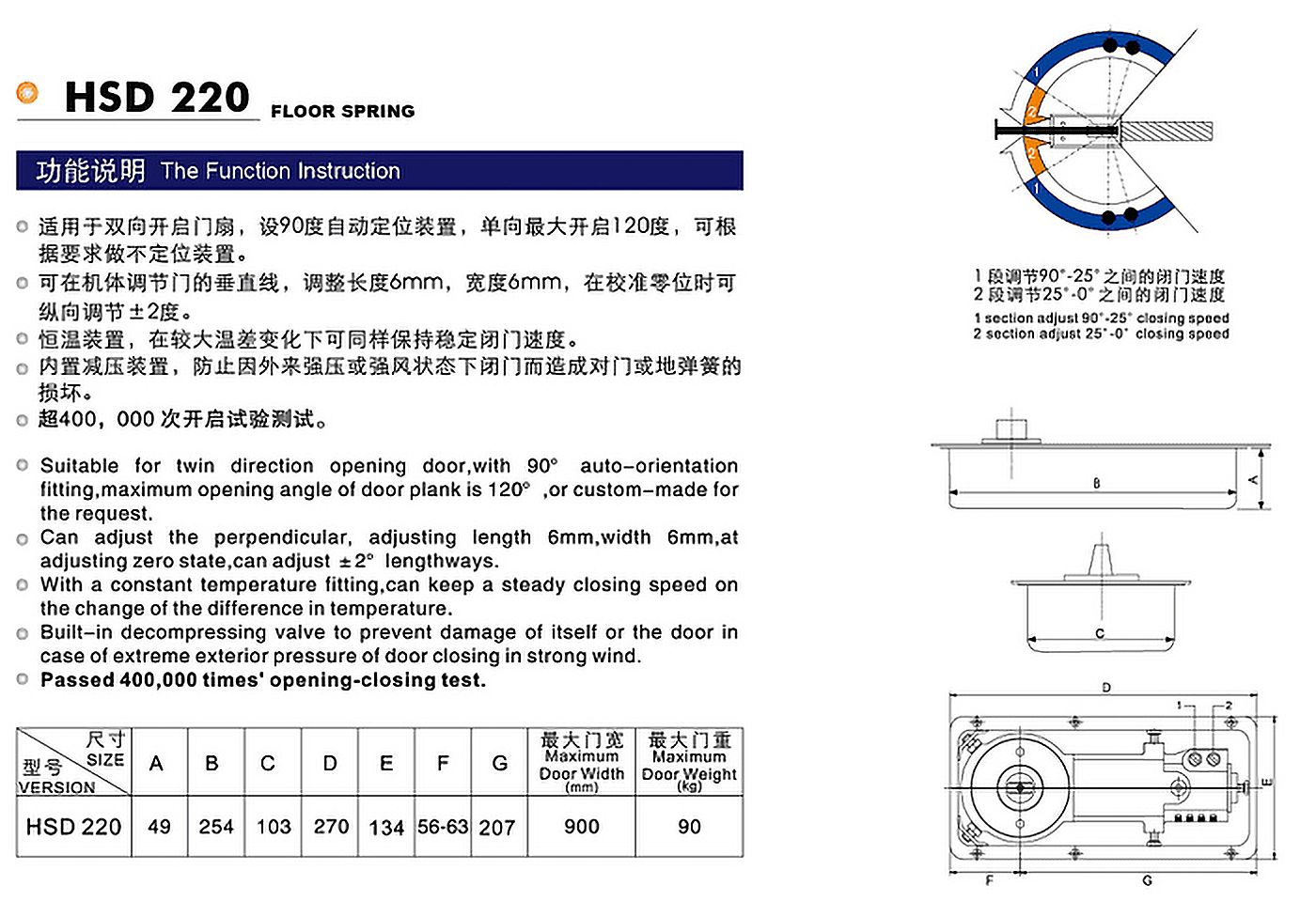 主要特點(diǎn): 適用于雙向開(kāi)啟門(mén)扇,設(shè)90度自動(dòng)定位裝置,單向最大開(kāi)啟120度,可根據(jù)要求做不定位裝置。