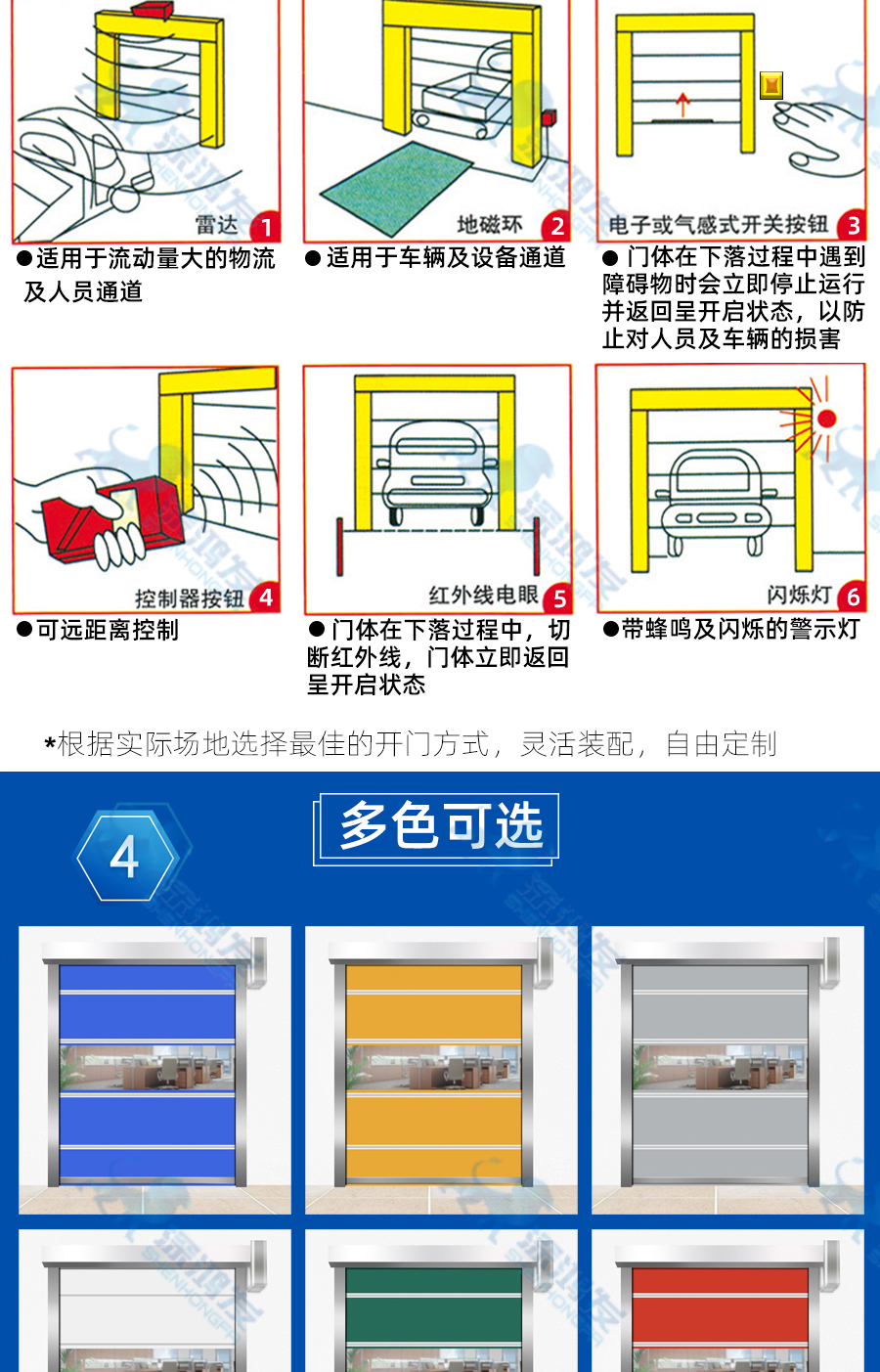 PVC快速卷簾門具有每秒運(yùn)轉(zhuǎn)速度超過0.6米的門,是快速升降的無障礙隔離門,主要作用是發(fā)揮快速隔離的作用,保證現(xiàn)場(chǎng)空氣質(zhì)量的清潔等級(jí)。PVC快速卷簾門具有快速開關(guān)、保溫、保冷、防蟲、防風(fēng)、防塵、隔音、防火、防異味、采光等多種功能,廣泛應(yīng)用于食品、化學(xué)、紡織、電子、超市、冷凍、物流、倉(cāng)庫等多種場(chǎng)所,高性能物流和清潔場(chǎng)所。