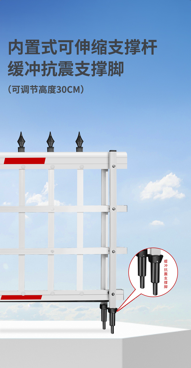 標(biāo)配防風(fēng)座,固定閘桿支撐腳,遇強(qiáng)風(fēng)有效減小閘桿損壞幾率