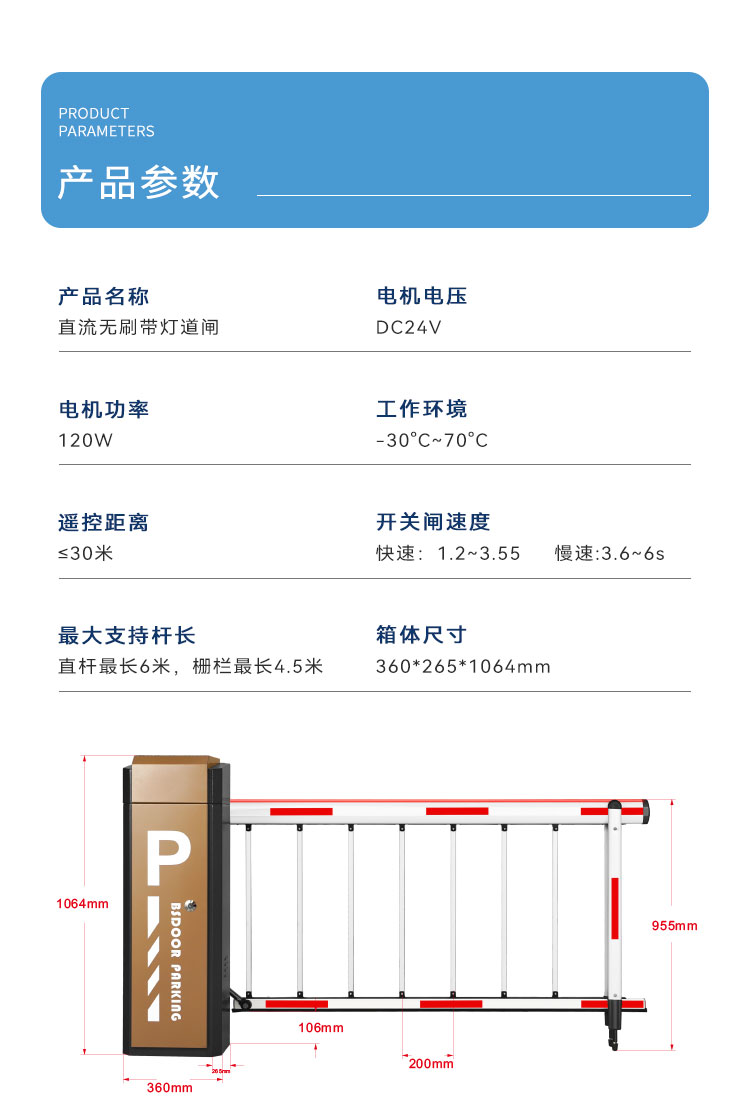 起落速度:直桿道閘:1.2~1.5s 3米直桿;直桿道閘:5~6s 6米直桿;伸縮桿道閘:5~6s 6米伸縮桿;柵欄道閘:3s~6s 3-4.5米柵欄桿