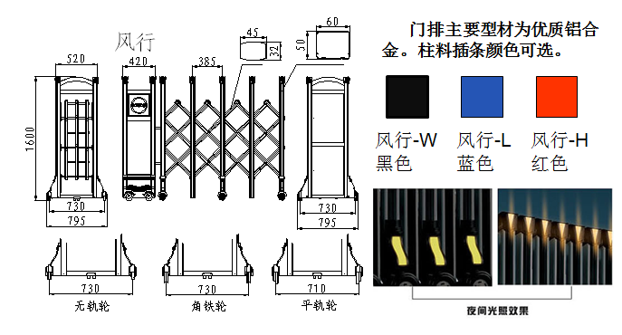 南北德信風(fēng)行-L鋁合金伸縮門門體采用公司自行加工優(yōu)質(zhì)不銹鋼和鋁型材等材料制作,主框架采用立體四維平行原理鉸接,伸縮靈活。伸縮門主要由門體、驅(qū)動器、控制系統(tǒng)構(gòu)成。驅(qū)動器采用特種電機驅(qū)動,蝸輪蝸桿減速,并設(shè)有手動離合器,停電時可手動啟閉,控制系統(tǒng)有臺控及遙控兩種??膳鋫錆L動顯示屏,顯示個性文字內(nèi)容。還可選配備智能紅外線探頭防碰撞裝置,運行時遇人或異物20-30CM可自動返回運行,從而保障車輛及行人的安全。適用于工礦企業(yè)、機關(guān)院校、娛樂場所、賓館飯店等庭院圍墻門。起到美化環(huán)境、改善企業(yè)面貌、提升企業(yè)形象;有助于營造文明社會、文明企業(yè)、文明城市氣氛;
