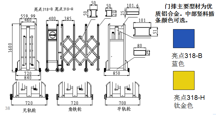 南北德信亮點(diǎn)318-H鋁合金伸縮門門體采用公司自行加工優(yōu)質(zhì)不銹鋼和鋁型材等材料制作,主框架采用立體四維平行原理鉸接,伸縮靈活。伸縮門主要由門體、驅(qū)動(dòng)器、控制系統(tǒng)構(gòu)成。驅(qū)動(dòng)器采用特種電機(jī)驅(qū)動(dòng),蝸輪蝸桿減速,并設(shè)有手動(dòng)離合器,停電時(shí)可手動(dòng)啟閉,控制系統(tǒng)有臺(tái)控及遙控兩種??膳鋫錆L動(dòng)顯示屏,顯示個(gè)性文字內(nèi)容。還可選配備智能紅外線探頭防碰撞裝置,運(yùn)行時(shí)遇人或異物20-30CM可自動(dòng)返回運(yùn)行,從而保障車輛及行人的安全。適用于工礦企業(yè)、機(jī)關(guān)院校、娛樂(lè)場(chǎng)所、賓館飯店等庭院圍墻門。起到美化環(huán)境、改善企業(yè)面貌、提升企業(yè)形象;有助于營(yíng)造文明社會(huì)、文明企業(yè)、文明城市氣氛;