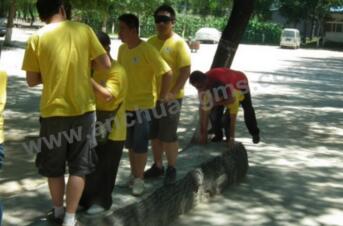 活動的最后是“漫漫人生路”由一對隊員扮演啞人,一對隊員扮演盲啞人,由啞人扶著盲啞人過障礙,在整個過程中都不能發(fā)出一點聲音,整個過程中啞人都小心翼翼的扶著身邊的人,而盲啞人也完全信任的把自己交給啞人帶領(lǐng),這個項目除了考驗大家的合作默契還要考驗對自己同事的信任。