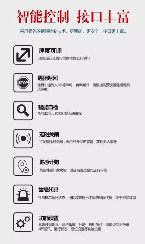 高速起桿,最快0.6s起桿;慢落桿,人性化安全設(shè)計;