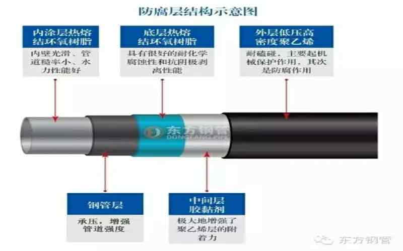 TPEP防腐鋼管是以鋼管為基材,外壁采用熱纏繞工藝三層結(jié)構(gòu)聚乙烯防腐,內(nèi)壁采用熱熔結(jié)環(huán)氧樹脂粉末在一定溫度條件下形成鋼塑合金層。(T,英文Three的首寫字母;PE指聚乙烯;EP指環(huán)氧樹脂。)