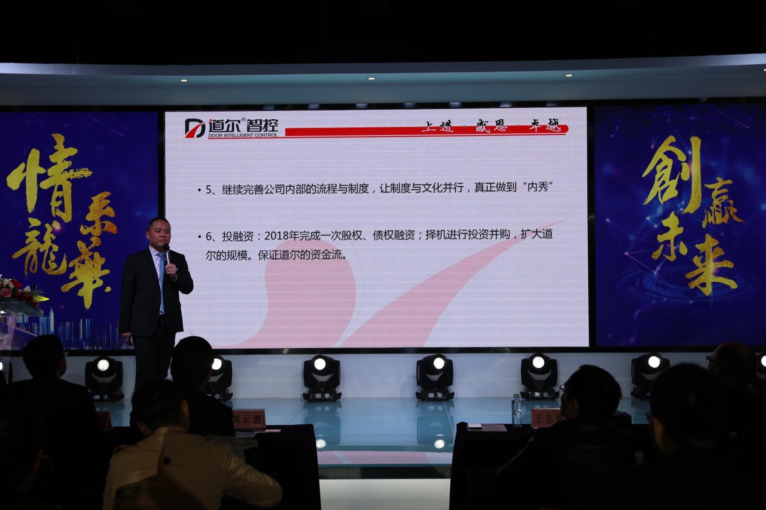 宣讀完畢,董事長王志剛作了工作報告。王總總結了2017年道爾取得的突出成就,向一年來兢兢業(yè)業(yè)努力工作的全體家人致謝,并將自己在工作生活中的經驗、思考感悟與家人們分享。王總擲地有聲的講話引起了現(xiàn)場家人們的共鳴。在大會上,王總還從市場、研發(fā)、文化建設、制度、投融資等方面對2018年的工作作出安排。相信道爾憑借扎實穩(wěn)健迅猛的發(fā)展勢頭,在新時代開局之年,必能迎來超越式的發(fā)展。
