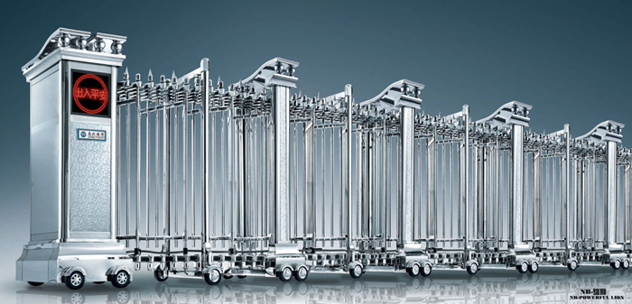 門體采用公司自行加工優(yōu)質(zhì)不銹鋼和鋁型材等材料制作,主框架采用立體四維平行原理鉸接,伸縮靈活。伸縮門主要由門體、驅(qū)動(dòng)器、控制系統(tǒng)構(gòu)成。驅(qū)動(dòng)器采用特種電機(jī)驅(qū)動(dòng),蝸輪蝸桿減速,并設(shè)有手動(dòng)離合器,停電時(shí)可手動(dòng)啟閉,控制系統(tǒng)有臺(tái)控及遙控兩種??膳鋫錆L動(dòng)顯示屏,顯示個(gè)性文字內(nèi)容。還可選配備智能紅外線探頭防碰撞裝置,運(yùn)行時(shí)遇人或異物20-30CM可自動(dòng)返回運(yùn)行,從而保障車輛及行人的安全。適用于工礦企業(yè)、機(jī)關(guān)院校、娛樂場(chǎng)所、賓館飯店等庭院圍墻門。起到美化環(huán)境、改善企業(yè)面貌、提升企業(yè)形象;有助于營造文明社會(huì)、文明企業(yè)、文明城市氣氛;