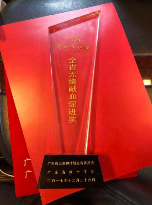 廣東省“2015-2016年度全省無償獻(xiàn)血促進(jìn)獎”榮譽(yù)證書
