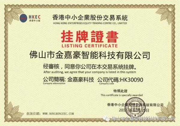 2017年12月25日,雙旦來(lái)臨之際,喜上加喜!在世界金融中心香港,佛山市金嘉豪智能科技有限公司成功掛牌全球中小企業(yè)股權(quán)交易中心(企業(yè)代碼HK30090),開(kāi)啟了邁向國(guó)內(nèi)外更高層次資本市場(chǎng)的航程。