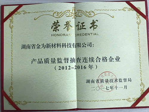 近日,湖南省質(zhì)量技術(shù)監(jiān)督局公布了2017年產(chǎn)品質(zhì)量監(jiān)督抽查連續(xù)合格企業(yè)名單,湖南省金為新材料科技有限公司秉承“安全源于品質(zhì),創(chuàng)新只為安全”的經(jīng)營理念,以優(yōu)質(zhì)、安全的產(chǎn)品,榮獲“產(chǎn)品質(zhì)量監(jiān)督抽查連續(xù)5年(2012-2016)合格企業(yè)”。