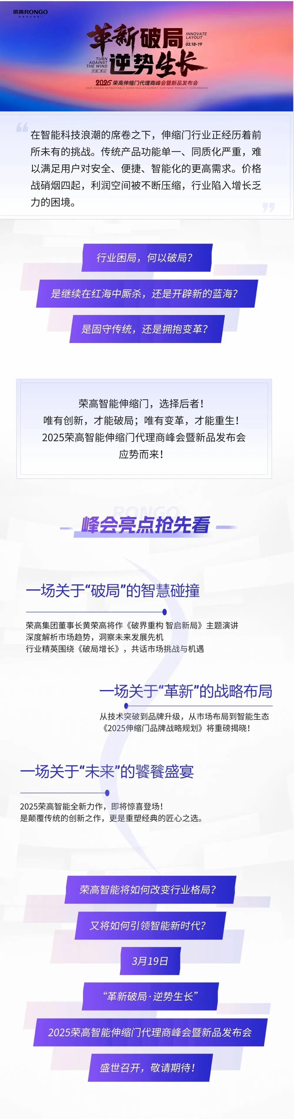 3月19日,“革新破局·逆勢(shì)生長(zhǎng)”2025榮高智能伸縮門代理商峰會(huì)暨新品發(fā)布會(huì)即將盛大啟幕!