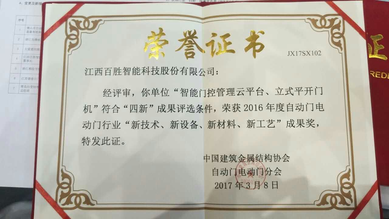 “智能門控管理云平臺、立式平開門機”榮獲“四新”成果獎。