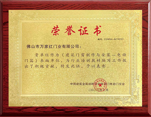 熱烈祝賀佛山市萬家紅門業(yè)有限公司榮獲《建筑門窗制作與安裝--電動(dòng)門篇》參編單位,為行業(yè)標(biāo)準(zhǔn)化發(fā)展盡獻(xiàn)一份力量。