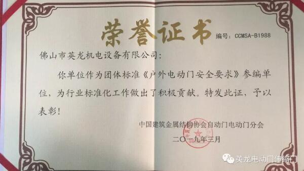 熱烈祝賀佛山英龍門(mén)業(yè)榮獲《戶外電動(dòng)門(mén)安全要求》參編單位榮譽(yù)。