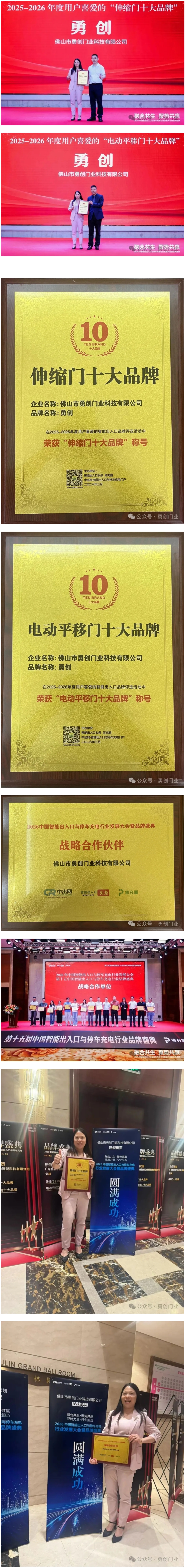 在同期舉辦的第十五屆智能出入口與停車(chē)充電行業(yè)頒獎(jiǎng)盛典上,佛山市勇創(chuàng)門(mén)業(yè)科技有限公司(勇創(chuàng)科技)憑借強(qiáng)勁綜合實(shí)力與行業(yè)影響力,一舉斬獲“電動(dòng)平移門(mén)十大品牌”“伸縮門(mén)十大品牌”“戰(zhàn)略合作伙伴”多項(xiàng)重磅大獎(jiǎng),載譽(yù)而歸。